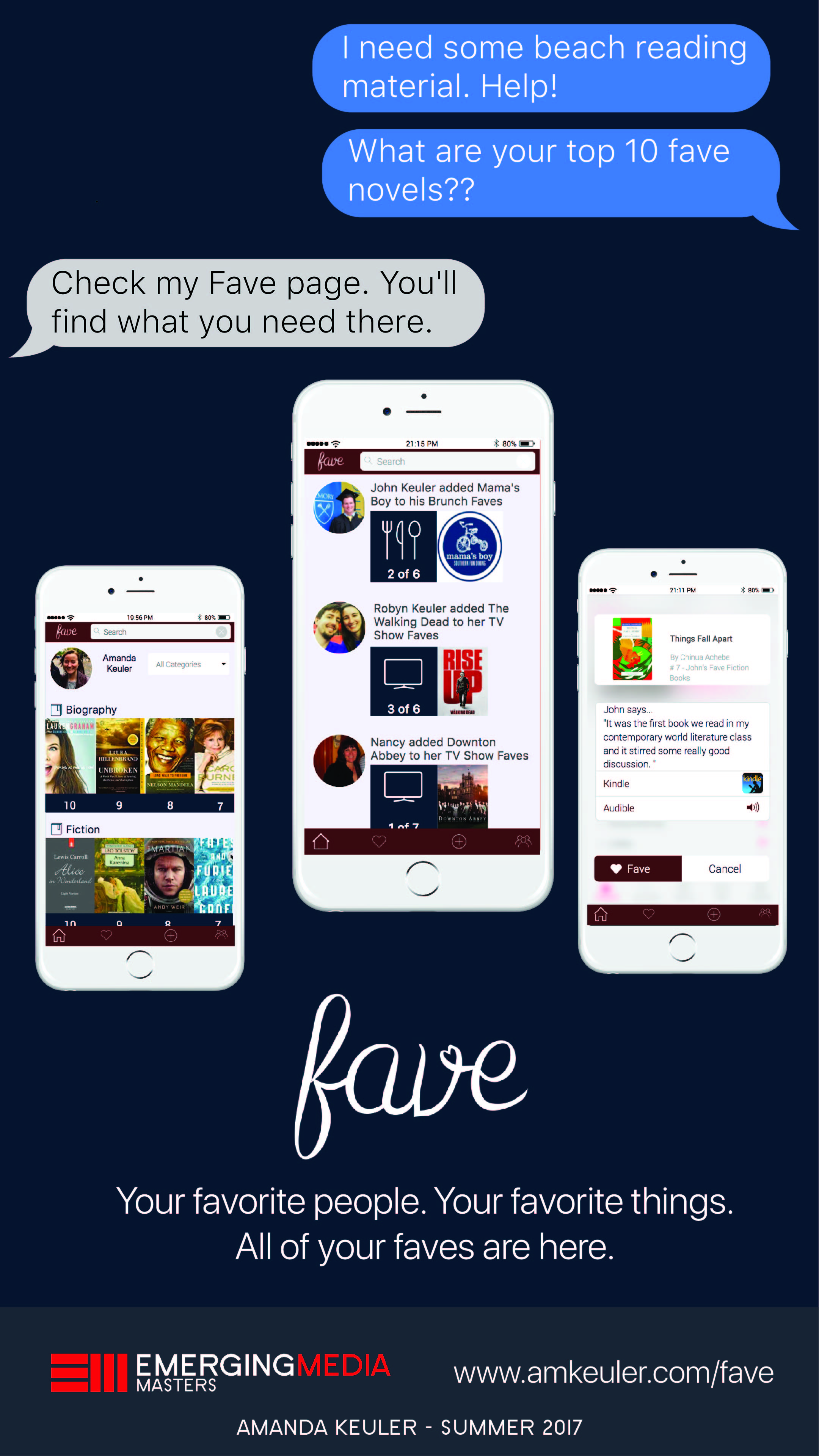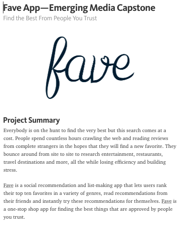 The idea for Fave was developed by Amanda Keuler, a UGA graduate student in the Emerging Media Program. For her capstone, she was tasked with solving a problem using technology. After experiencing frustrations in her own searches, Amanda came up with the idea for Fave.