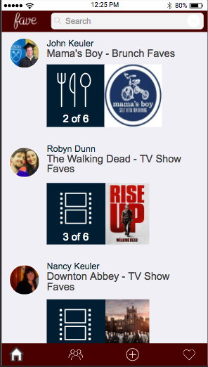 When fully developed, Fave will connect you with your friends using Facebook Login for Apps. This feature uses information from your Facebook profile (with your permission) and automatically creates your profile and Friend List. To see your Friend List, tap on the people icon in the lower navigation.